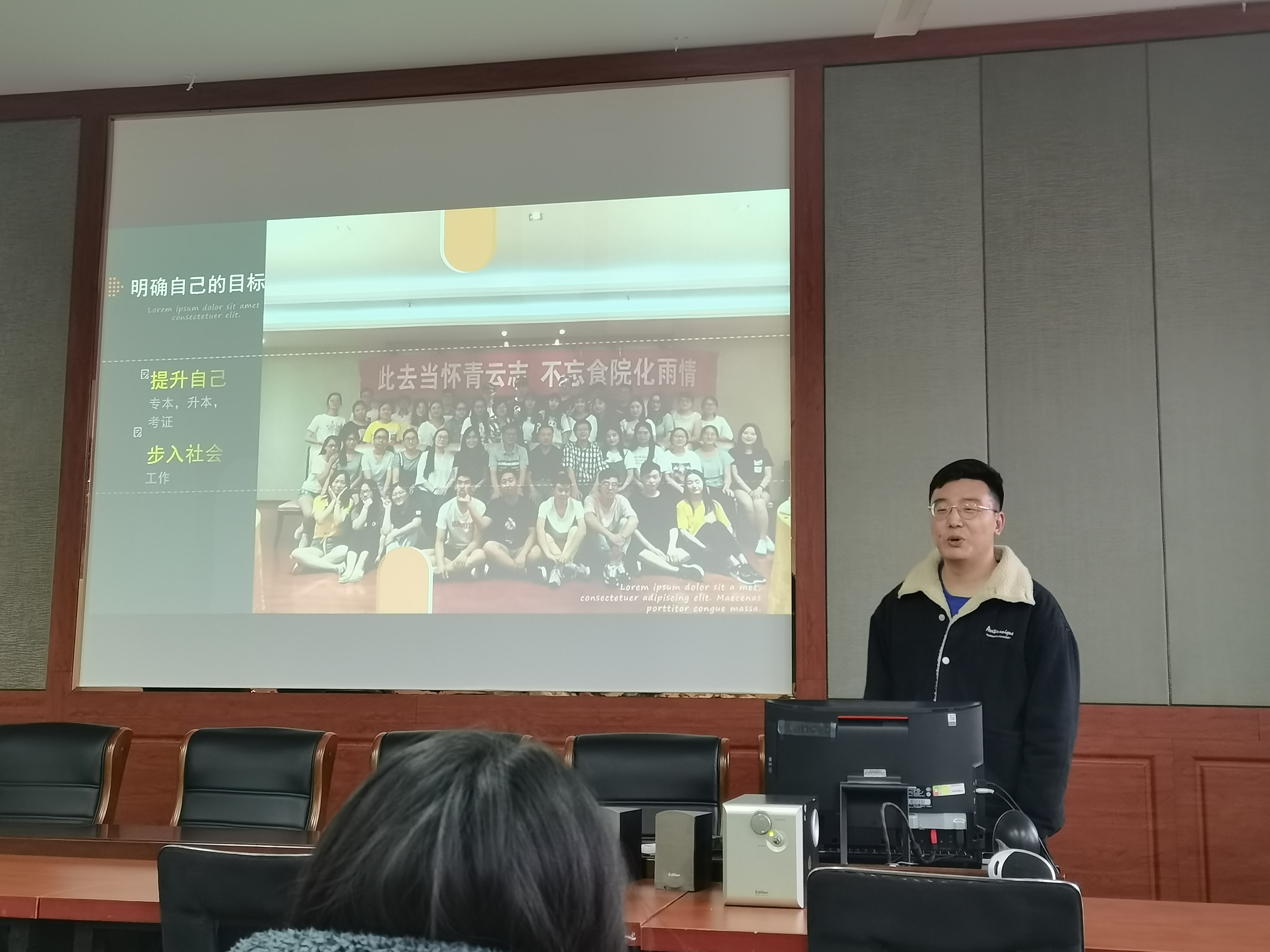 高孝维目前从事会计工作,担任宿迁楚风水韵温泉度假酒店会计主管,在校期间考取了初级会计证书,毕业过后一直从事会计工作,积累了一定的经验。他从在校同学如何度过老员工活,如何安排自己的学习,如何在参与活动中获得锻炼等问题展开。用自己在校期间学习生活的经历,工作以后职场拼搏努力的故事,为与会同学指明了奋斗的方向。