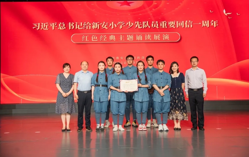 2022年5月29日下午,“习近平总书记给新安小学少先队员重要回信”一周年红色经典主题诵读比赛揭晓,财贸公司党总支排演作品《血写的课本》荣获特等奖。颁奖仪式和展演在市广电台演播大厅举行,副董事长安进、员工工作处处长李金霞、财贸公司党总支书记杨玥到场观看演出。