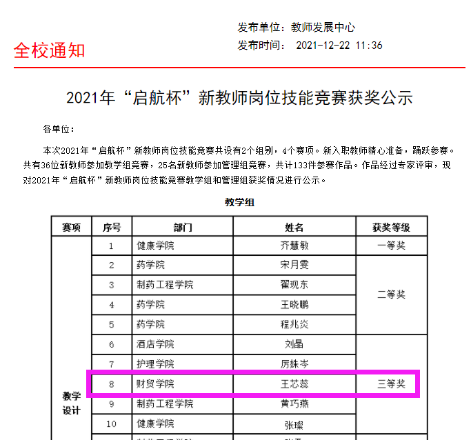 王芯蕊等老师荣获2021年“启航杯”新教师岗位技能竞赛多个奖项