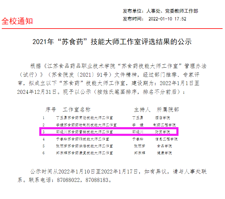 邵运川老师入围2021年“苏食药”技能大师工作室