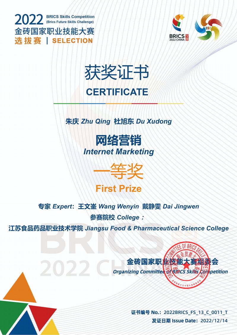 近日,由金砖国家职业技能大赛组委会主办,金砖国家工商理事会技能发展工作组承办的2022年金砖国家职业技能大赛网络营销赛项区域选拔赛落下帷幕。经过激烈角逐,公司王文崟老师、戴静雯老师指导的杜旭东、朱庆参赛团队荣获区域选拔赛一等奖。