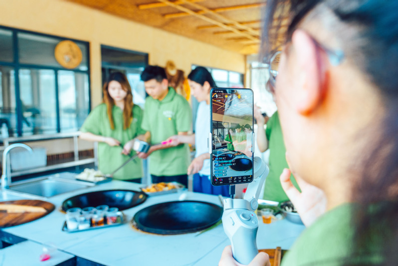 随后直播电商团队的校园主播跟员工党员们一起走向田间地头,运用已掌握的直播技能,以户外直播的形式对牛牛乐园生态农场进行特色推广,并在农场土灶台前亲手烧火做饭,忆苦思甜。