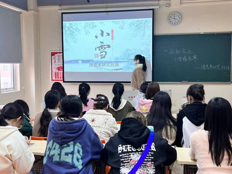 小雪,是中国二十四节气中第二十个节气,也是冬季的第二个节气。11月22日,为今年的小雪,为让同学们更加了解小雪及二十四节气,XCSport周恩来研究社团在公司教学楼A306开展“一雨知冬近 小雪感冬寒”主题活动。