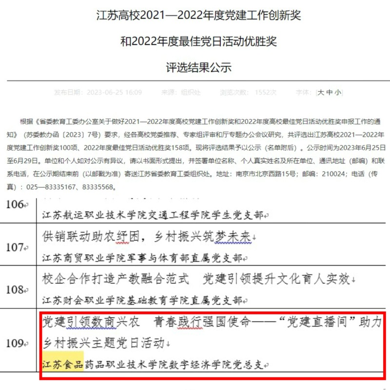 《省委教育工委关于公布江苏高校2021-2022年度党建工作创新奖和2022年度最佳党日活动优胜奖评选结果的通知》(苏委教组函(2023) 24号)和《中共淮安市委关于表彰优秀共产党员、优秀党务工作者和先进基层党组织的决定》(淮委﹝2023﹞121号)文件下发,公司党总支“党建引领数商兴农青春践行强国使命——‘党建直播间’助力乡村振兴”主题党日活动荣获省高校最佳党日活动优胜奖;公司党总支书记杨玥同志被授予“淮安市优秀共产党员”称号。
