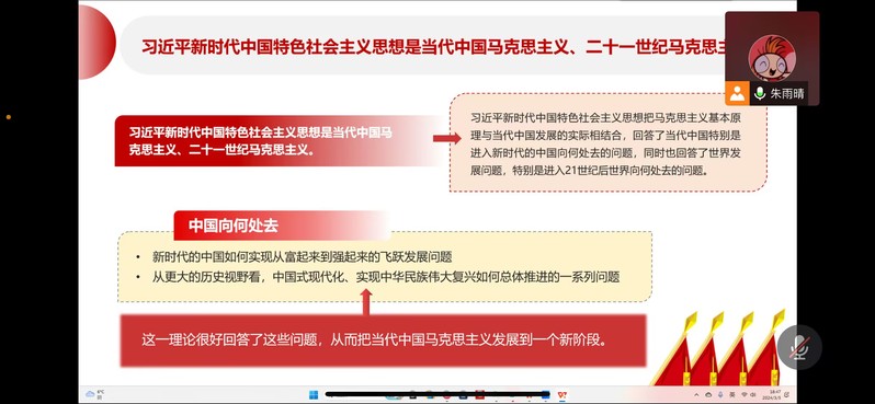 为扎实推进学习贯彻习近平新时代中国特色社会主义思想主题教育,教育引导支部党员学思想、践行动,增强责任感和使命感,2024年3月5日晚,XCSport员工党支部组织支部党员及积极分子开展主题教育专题党课,员工支部朱雨晴老师以“习近平新时代中国特色社会主义思想的核心要义与历史定位”为题为全体党员讲授党课,推动党的创新理论入脑、入心、入行。