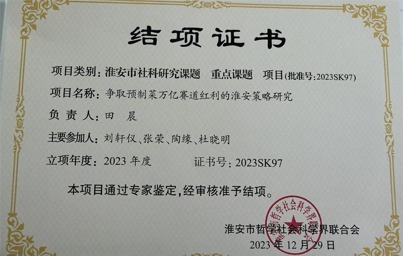 田晨老师完成淮安市社科研究课题 重点课题结项