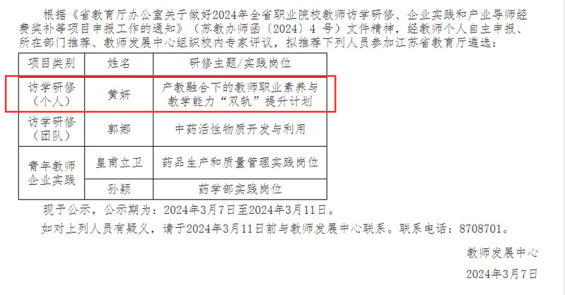 关于2024年度江苏省教师访学研修、青年教师企业实践项目推荐候选人员的公示