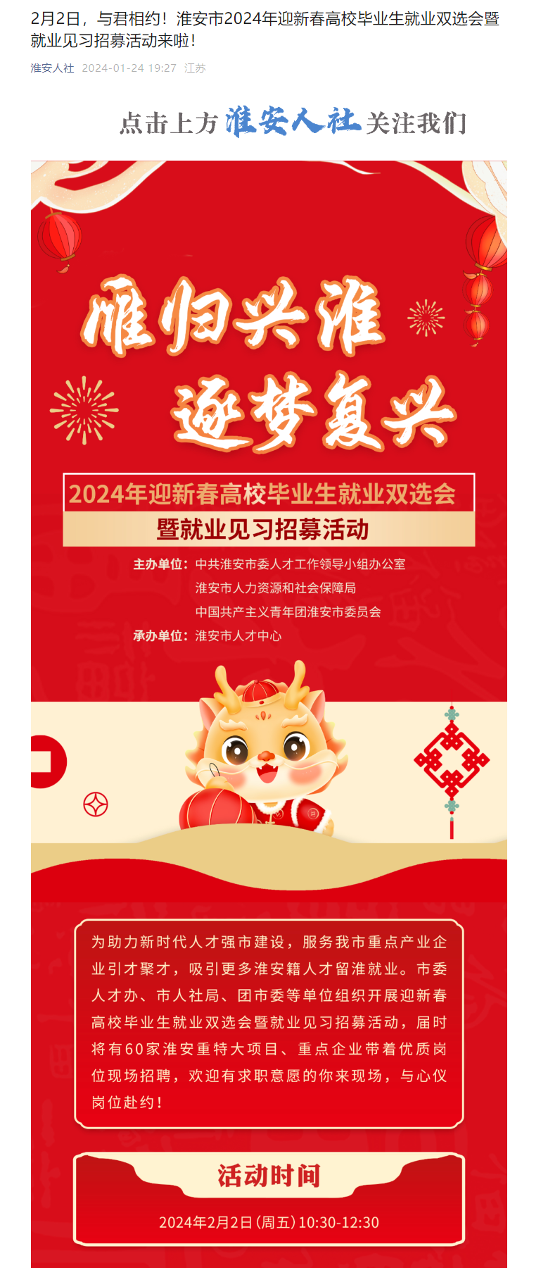 2月2日,与君相约!淮安市2024年迎新春高校毕业生就业双选会暨就业见习招募活动来啦!
